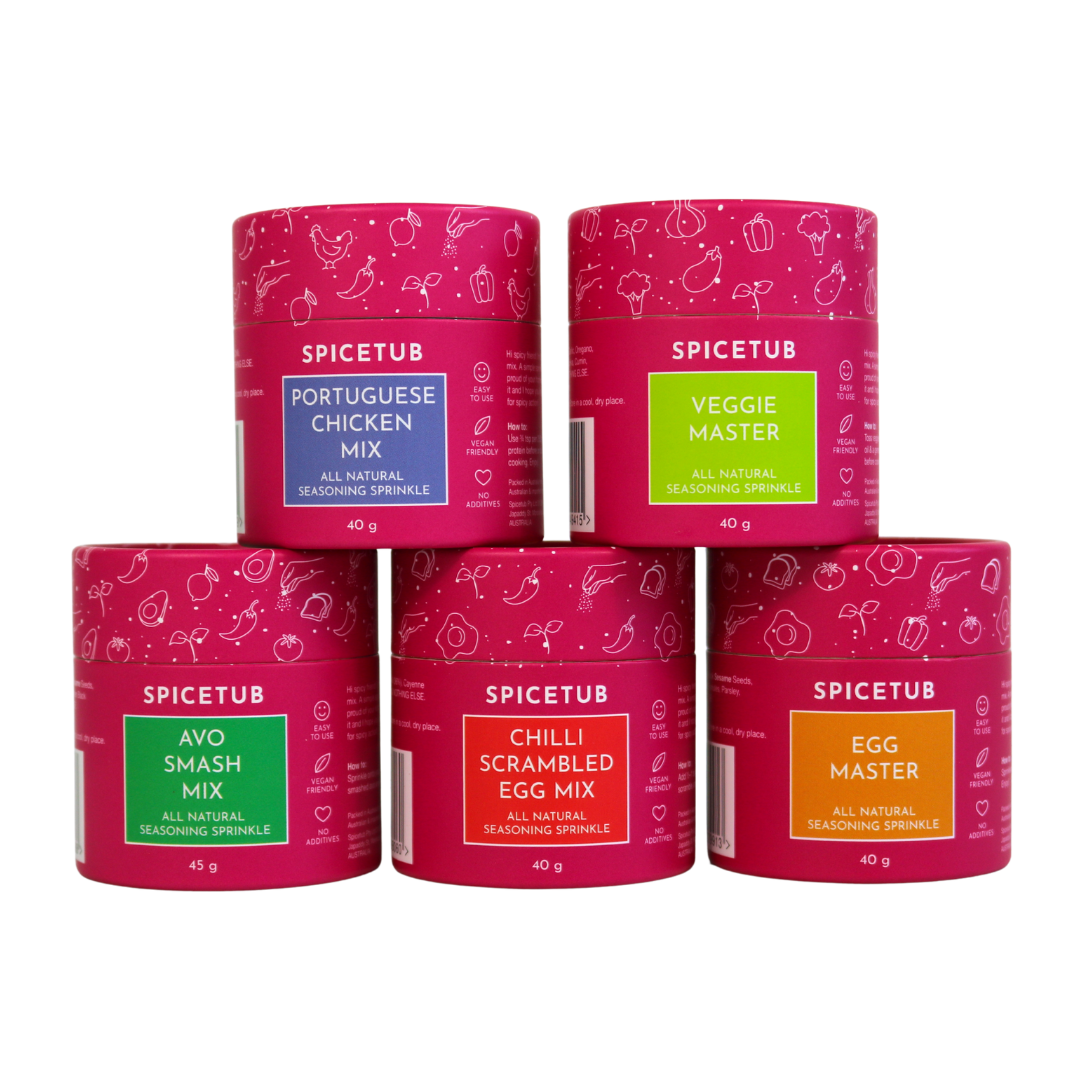 One tub each: Egg Master, Avo Smash Mix, Chilli Scrambled Egg Mix, Portuguese Chicken Mix, Veggie Master.