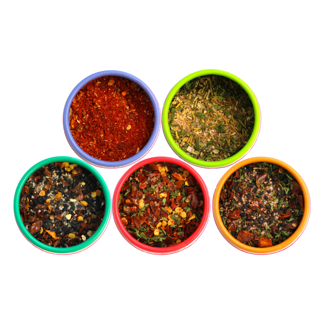 From no-heat (Egg Master) to buildable heat (Chilli Scrambled Egg Mix & Portuguese Chicken Mix). Veggie/Avo are mild.